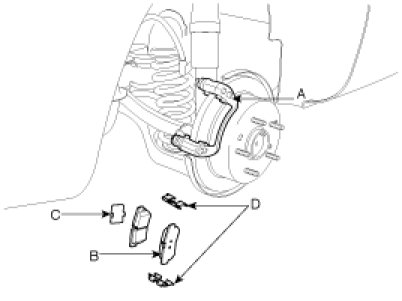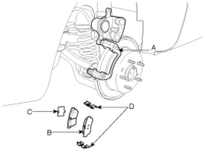 3. Remove the pads (B), the pad shims (C) and the pad springs (D) from the caliper carrier (A).