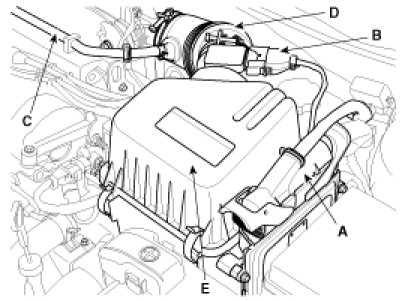 (4) Remove the intake air hose and air cleaner (E).