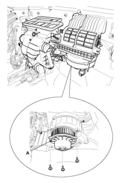 3. Remove the blower motor (A) after loosening the mounting screws.