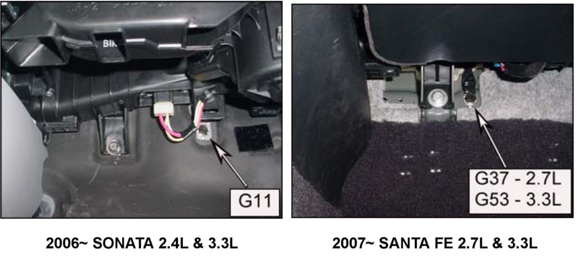 6. P0722 ONLY: For 2006~ Sonata, 2007~ Santa Fe, 2007~ Entourage and 2006~ Azera vehicles, check the ground bolt at the location shown. Confirm the threads are clean and the bolt is tight.