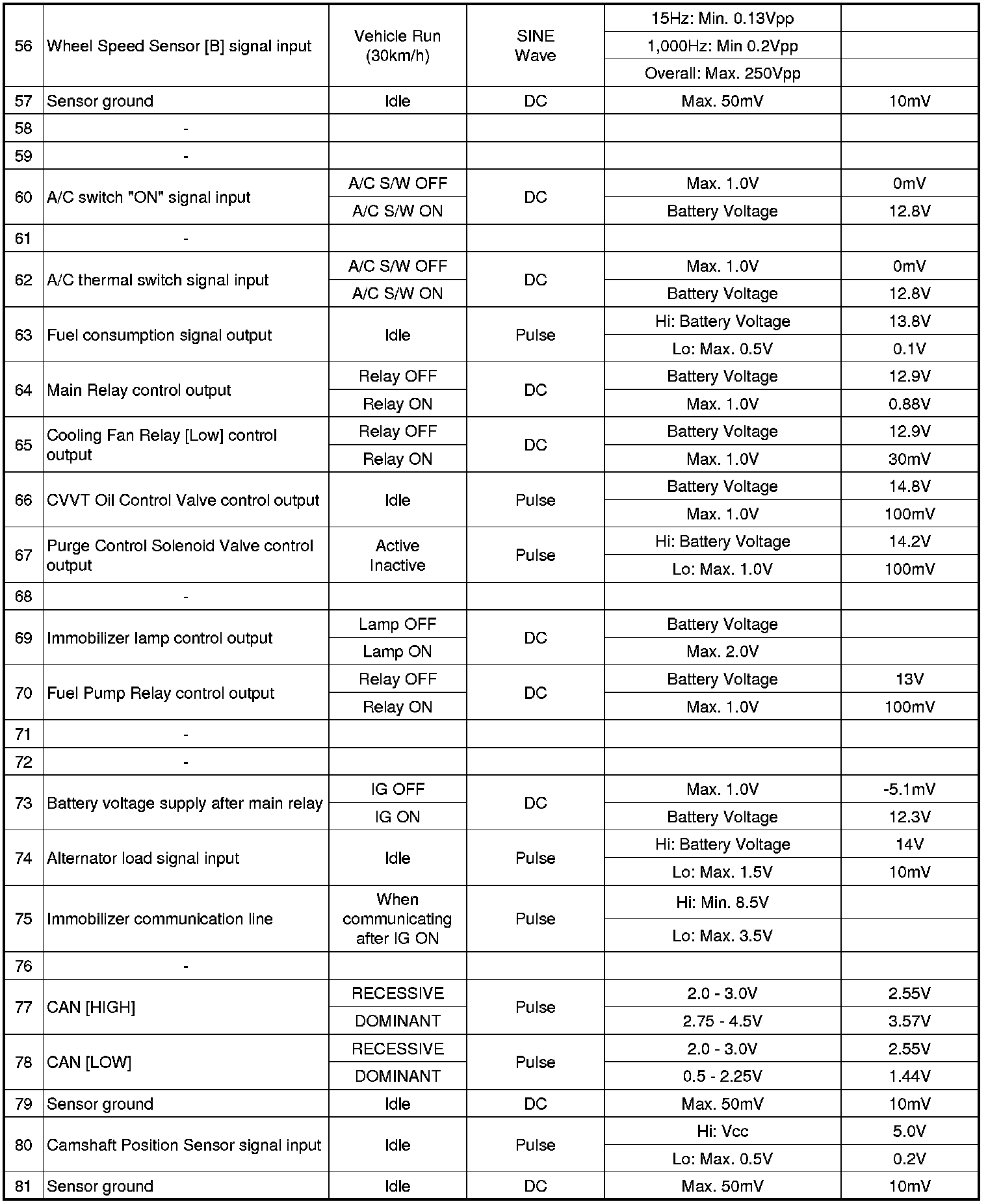 Pinout Values and Diagnostic Parameters