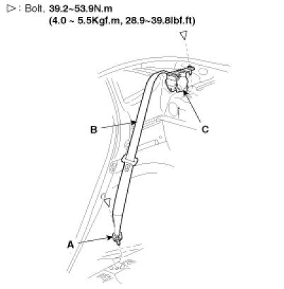 4. After loosening the retractor (C) mounting bolt, remove the rear seat belt (B).