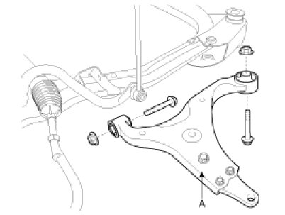 4. Loosen the bolts and nut and then remove the lower arm (A) from the sub frame.