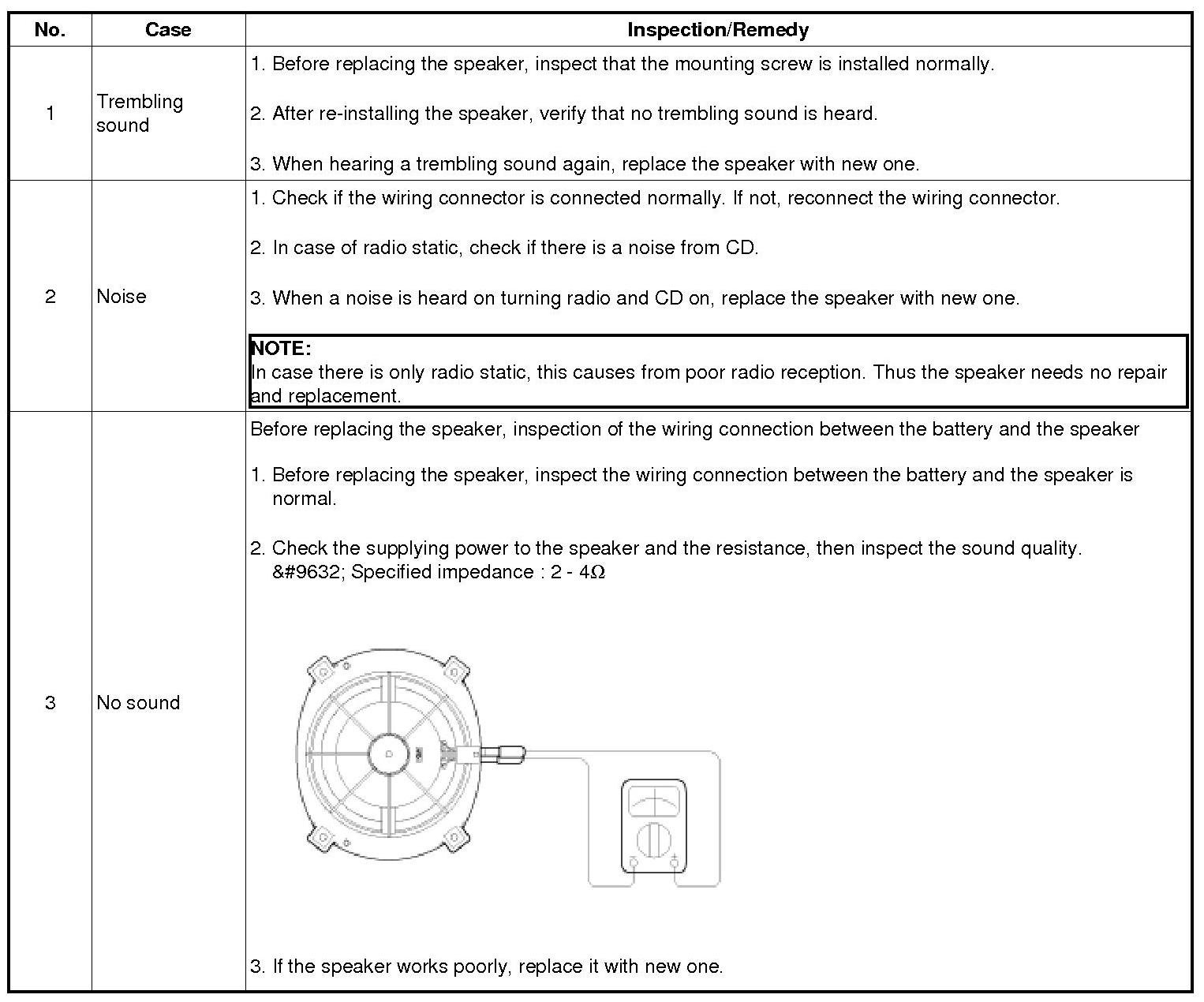 Inspect the sound from speaker after verifying that the speaker mounting screws is removed and the wiring connector is connected precisely to remove vibration transmitted from body trims and surrounding parts.