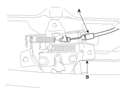 4. Disconnect the hood latch cable (A) and remove the latch (B).