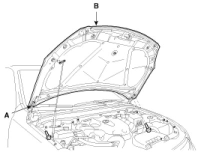 1. After loosening the hood hinge (A) mounting bolts,remove the hood (B).