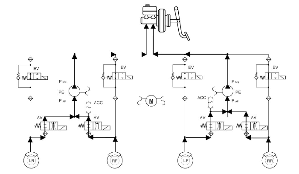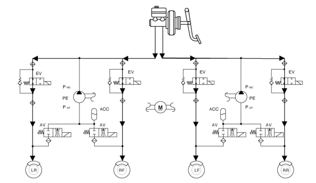 - Input of signal from Pressure sensor, Steering angle sensor, Yaw & Lateral G sensor, the wheel speed sensors attached to each wheel.