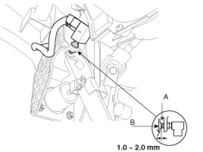 Screw in the stop lamp switch until its switch rod is fully depressed (threaded end (A) touching the pad (B) on the pedal arm) then brake off the switch 3/4 turn to make 1.0 - 2.0 mm(0.04 - 0.08 in.) of clearance between the stop lamp switch pad. Make sure that the brake lights go off when the pedal is released.