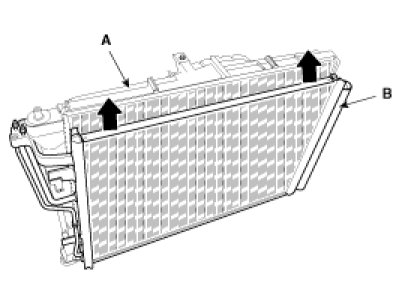 5. Remove 2 bolts, and then remove the condenser by lifting it up. Be careful not to damage the radiator and condenser fins when removing the condenser (B).