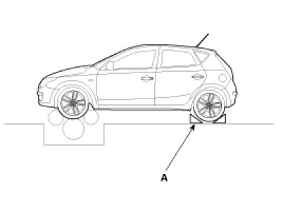 2. Drive the vehicle onto a speedometer tester. Use wheel chocks(A) as appropriate.