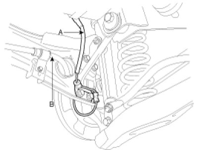 8. Install the wheel speed sensor (A) and parking brake cable (B).