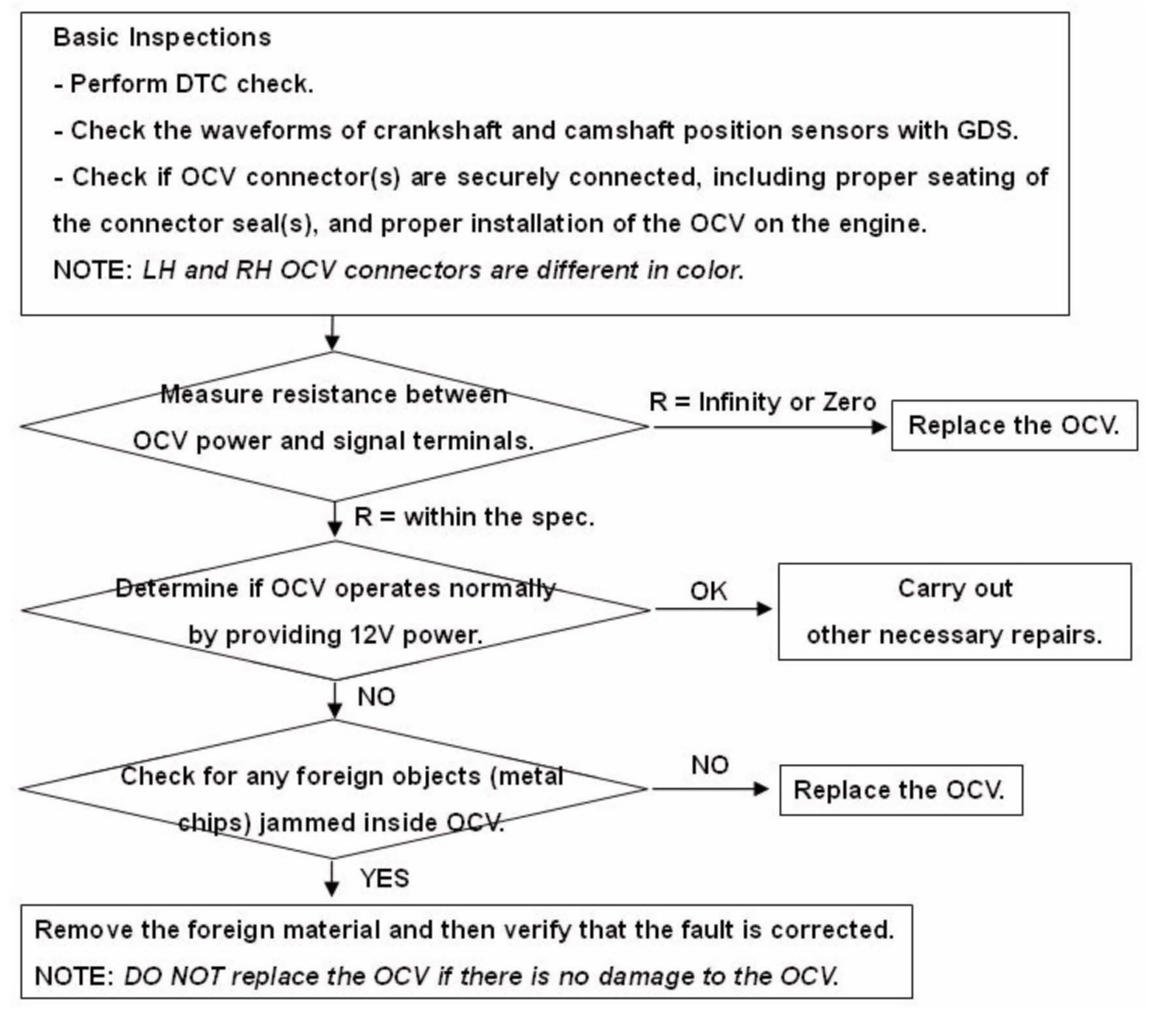 When diagnosing the Continuously Variable Valve Timing (CVVT) system for rough idling, poor acceleration, camshaft timing misalignment-related trouble codes, misfire related trouble codes, and/or other related symptoms, it may be required to inspect the Oil Control Valve (OCV) for proper operation. Follow the procedure outlined in this bulletin to inspect the OCV. If the OCV operates normally, then carry out other necessary repairs. Do not replace the OCV if normal operation is confirmed.