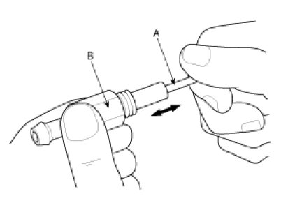 1. Insert a thin stick (A) into the PCV valve (B) from the threaded side to check that the plunger moves.