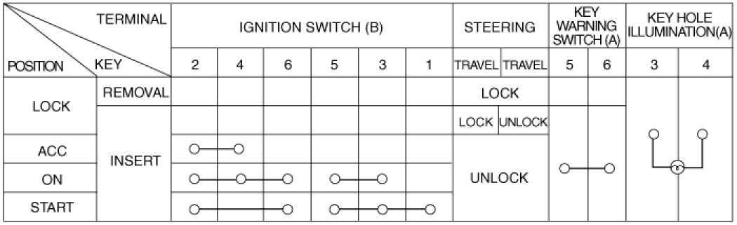 1. Disconnect the ignition switch connector (B) and key warning switch connector (A) from under the steering column.