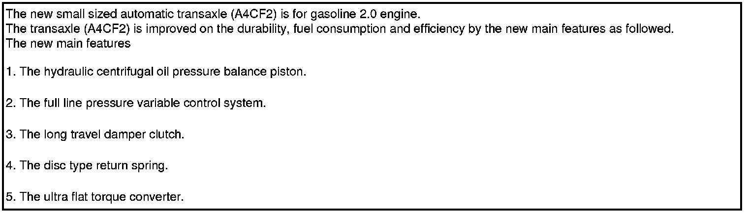 The VFS (Variable Force Solenoid) installed in the valve body is applied to transaxle(A4CF2). VFS varies the line pressure from 4.5bar to 10.5bar according to throttle open angle and shift range to improve the fuel consumption and shift ability.