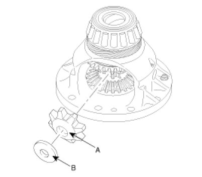 5. Remove the two differential pinion gears (A) with washer (B).