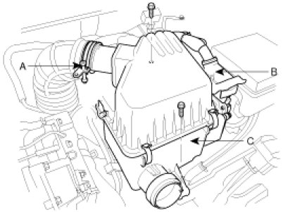 19. Install the air cleaner assembly (C) by connecting the clamp (A) and the ECM connector (B).
