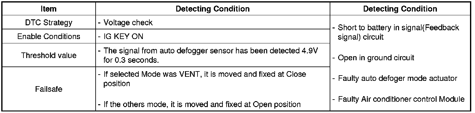 Air conditioner Control Module sets DTC B1284 if The signal from auto defogger mode actuator has been detected 4.9V for 0.3 seconds.