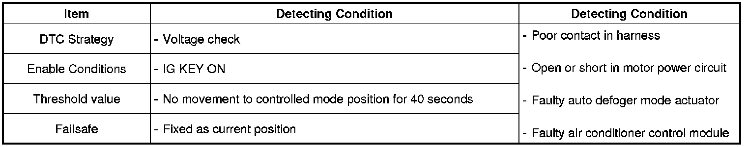 Air conditioner Control Module sets DTC B1285 if auto defogger mode actuator has not been moved to the mode, where air condition control module controls, within 40 seconds.