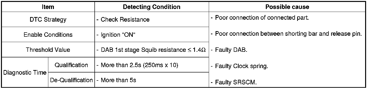 The SRSCM sets DTC B1347 if the measured resistance value of DAB circuit is less than the threshold value (1.0 ohms) *In this case, SRSCM checks if there's any fault in circuit by sending current for a while.