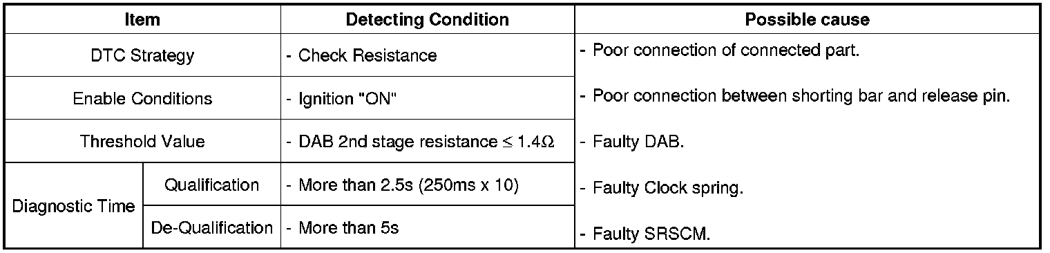 The SRSCM sets DTC B1482 if the measured resistance value of DAB circuit is less than the threshold value (1.0 ohms)