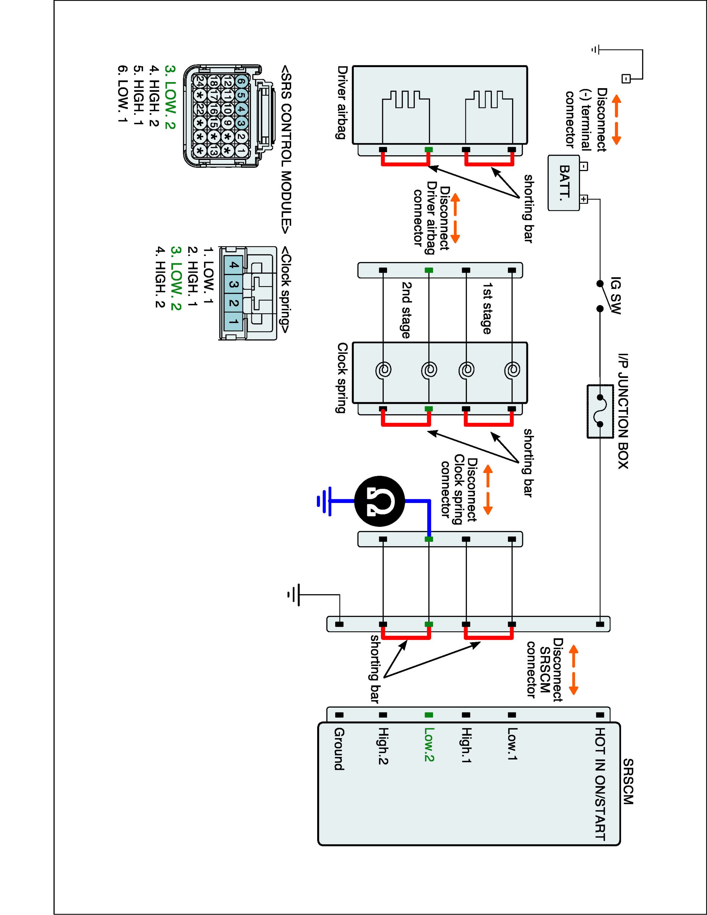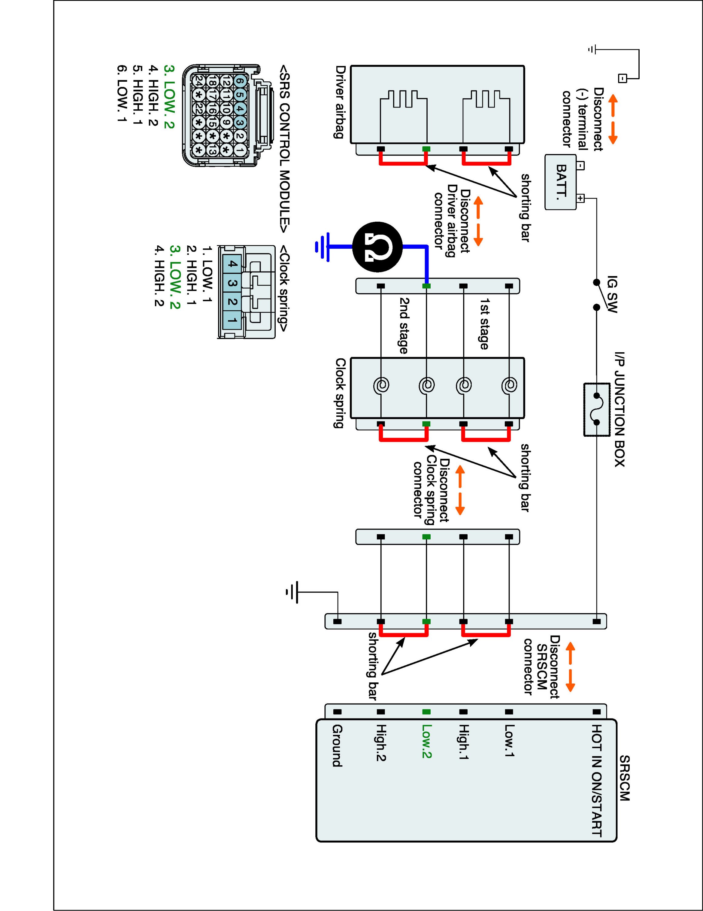 4. Measure resistance between terminal "Low.2" or "High.2"of the clock spring harness connector and chassis ground.