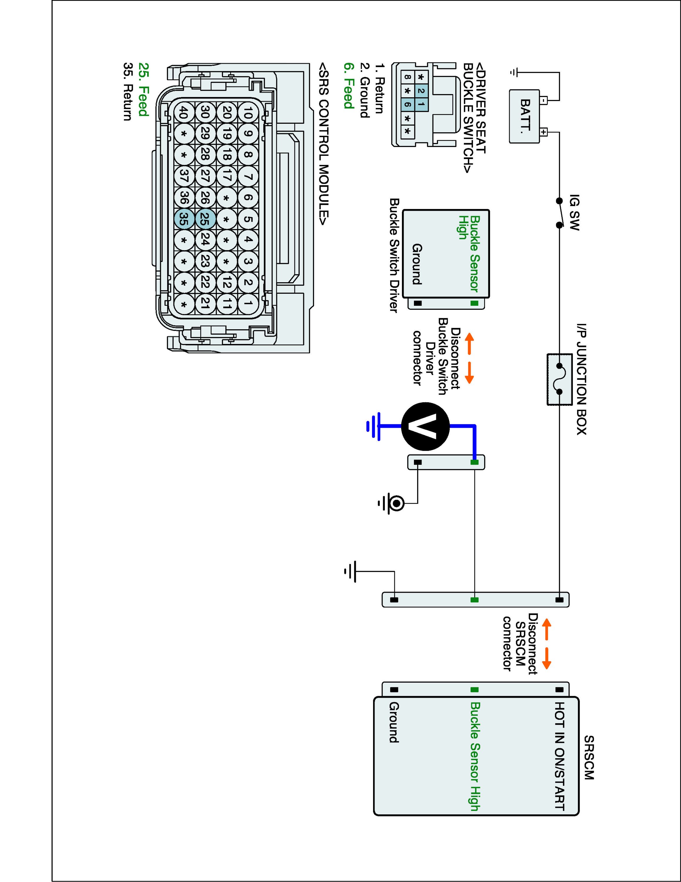 4. Measure resistance between of the Buckle Switch Driver wiring connector and SRSCM harness connector.