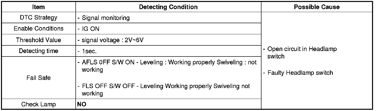 AFLS (Adaptive Front-Lighting System) provides driver with the best visibility by adjusting vertical direction of the headlamp. It consists of AFLS ECU, Leveling Actuator-Intelligent Stepper Motor, Swivel Actuator, Head lamp switch, Height sensor (not applied to ECS). For efficient operation of system, AFLS ECU check Battery voltage.Battery function is supply power to AFLS ECU and Actuators.AFLS ECU detect to headlamp signal that controlled by multi-function switch in order to decide headlamp operation.