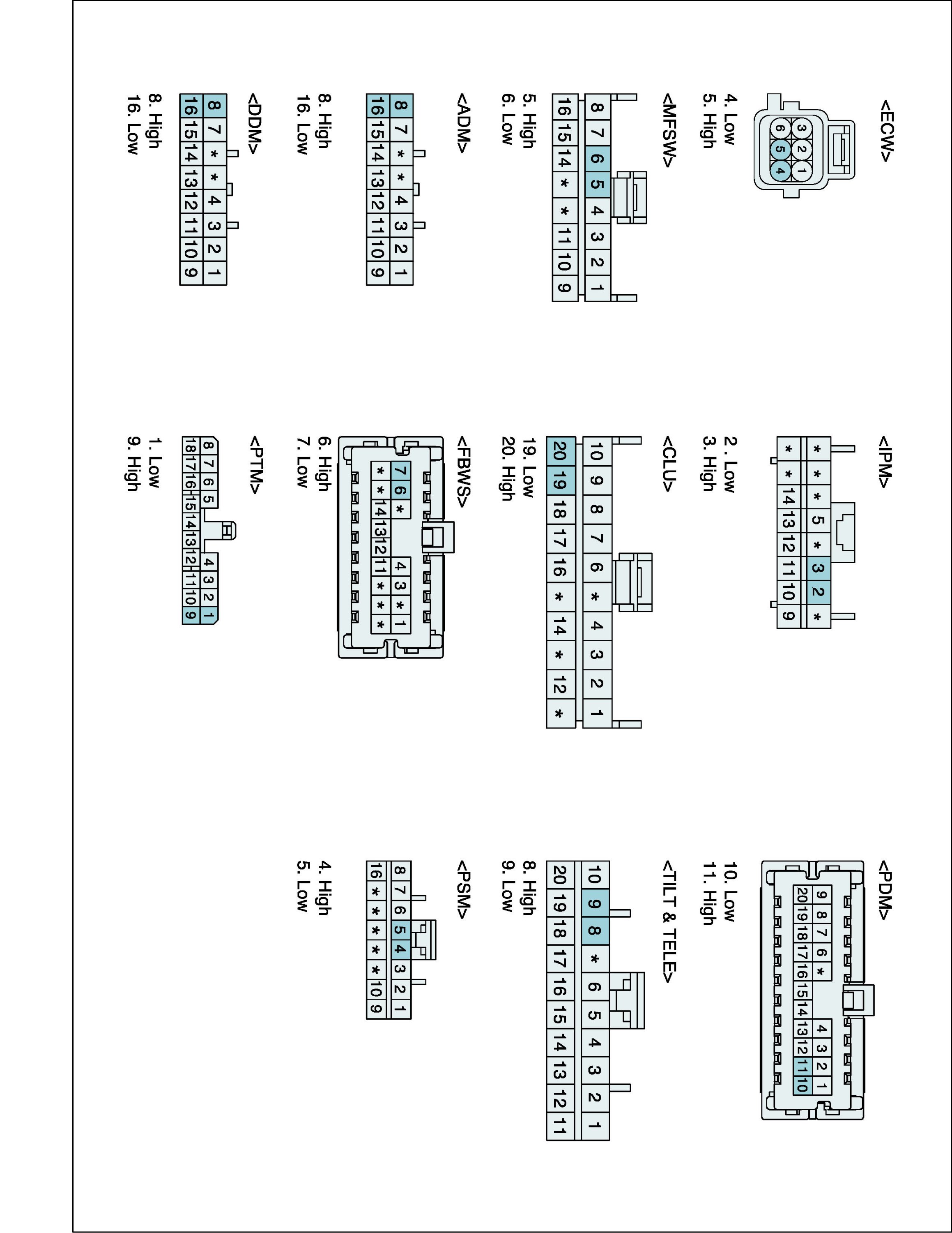 They are IPM (Inter Panel Module), FAM (Front Area Module), PDM (Power Distribution Module), DDM (Drive Door Module), ADM (Assist Door Module), ECW (Electronic Control Wiper), CLU (Cluster), MFSW (Multi Function Switch), PSM (Power Seat Module), SCM (Steering Control Module), PTM (Power Trunk Lid Module), FBWS (Front Back Warning System), DATC (Dual Auto Temperature Control Module).