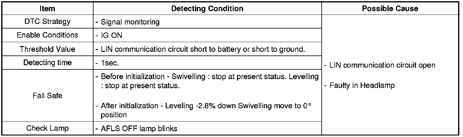 LIN (Local Interconnect Network) is direct communication system to low-cost for electric system of vehicle.height sensor signal, vehicle speed, steering angle sensor signal are input to AFLS ECU to find out of headlamp position and AFLS ECU drive actuators through LIN communication.AFLS (Adaptive Front-Lighting System) drive Leveling Actuator-Intelligent Stepper Motor for adjusting up and down, and Swivel Actuator for adjusting right and left side.