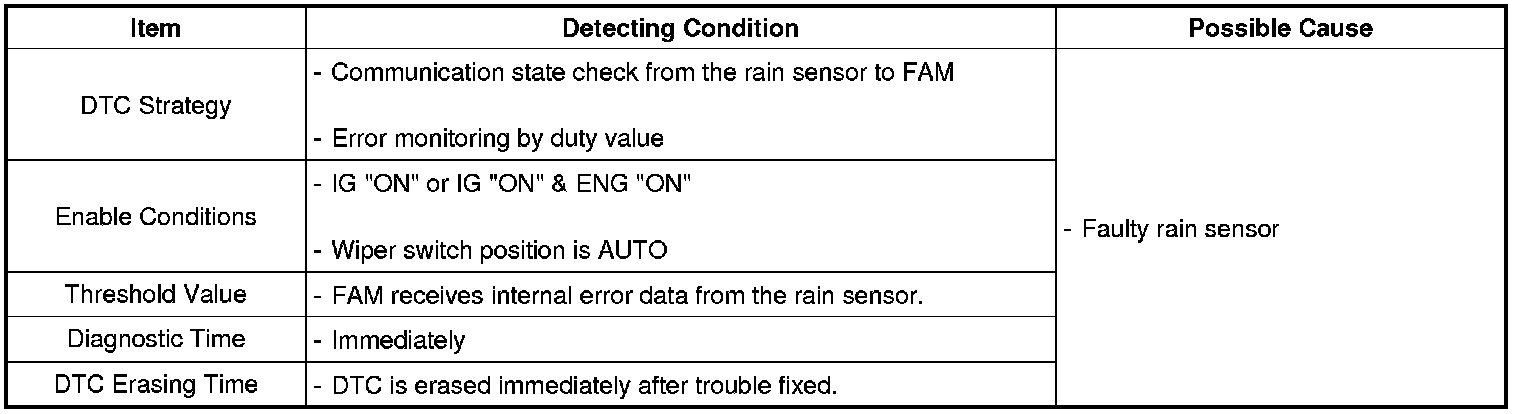 FAM outputs this code when it detects internal error of rain sensor after wiper switch has been turned to AUTO under IG "ON" or IG "ON" & ENG "ON".