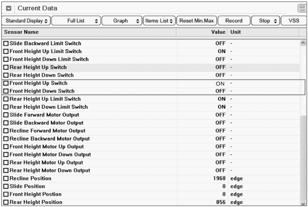 3. Check whether "Seat Front Side Switch" is turned to "ON" when the control switch is pressed. (UP, DOWN)