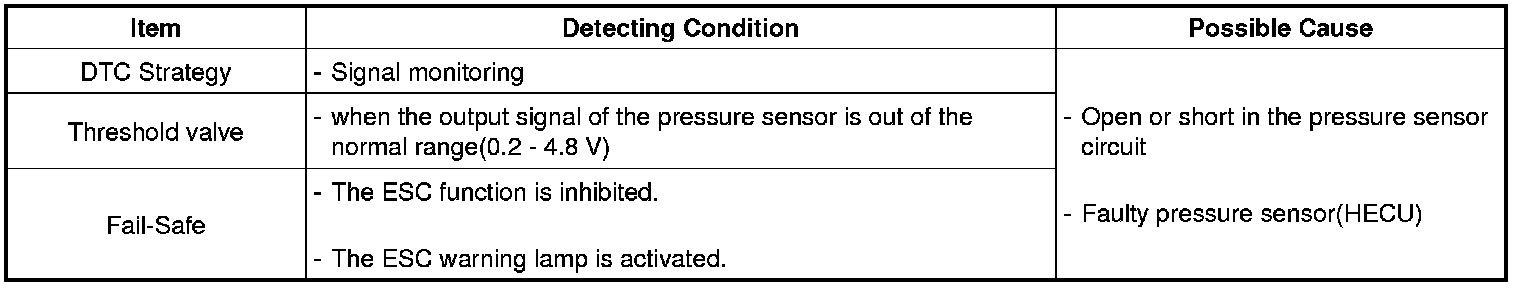 The HECU monitors the signal of pressure sensor and if the signal is out of the normal range, this DTC is set.