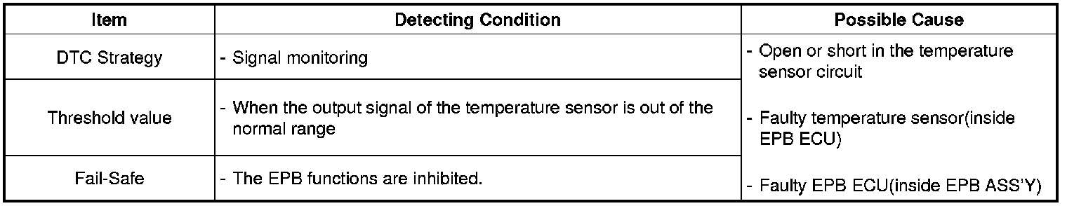 The EPB ECU monitors the signal of the temperature sensor and if its value is out of the normal range, this DTC is set.