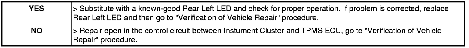3. Measure resistance between Rear Left LED control terminal of TPMS ECU harness connector and Rear Left LED control terminal of Instrument Cluster harness connector.