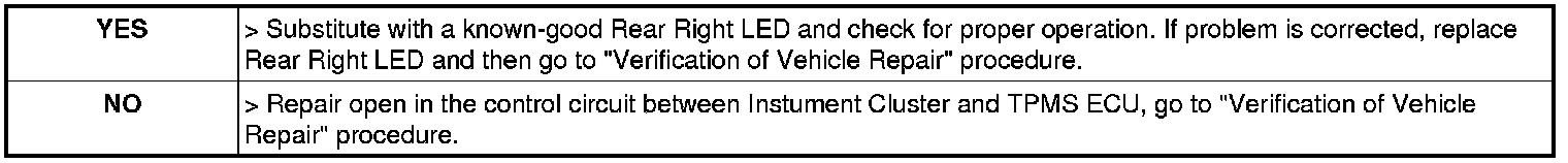3. Measure resistance between Rear Right LED control terminal of TPMS ECU harness connector and Rear Right LED control terminal of Instrument Cluster harness connector.