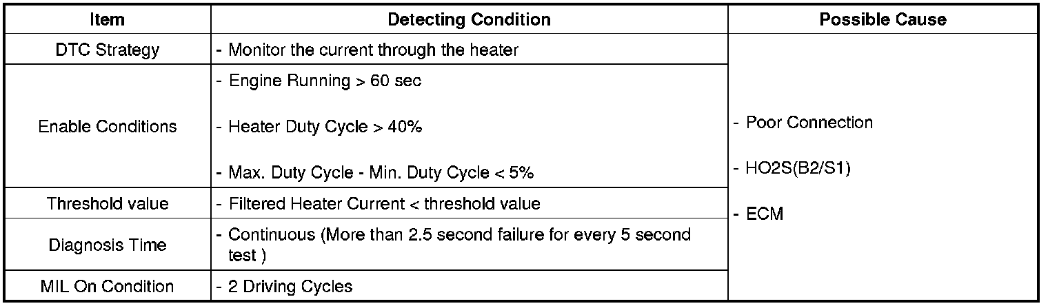 Checking current from HO2S under detecting condition, if the heater current is below a certain threshold for more than predeterminate time, ECM sets P0050. MIL (Malfunction Indication Lamp) turns on when the malfunction lasts till consecutive 2 driving cycle.