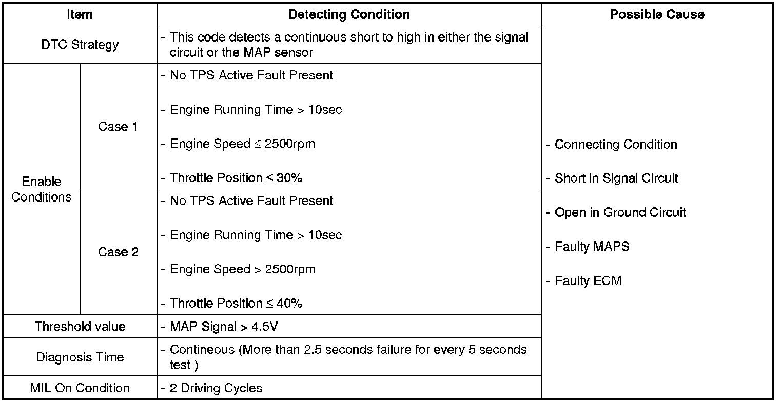 Checking output signals of MAPS every 5 sec. under detecting condition, if an output signal is above 4.5V for more than 2.5 sec., ECM sets P0108. MIL (Malfunction Indicating Lamp) turns on when the malfunction lasts till consecutive 2 driving cycle.
