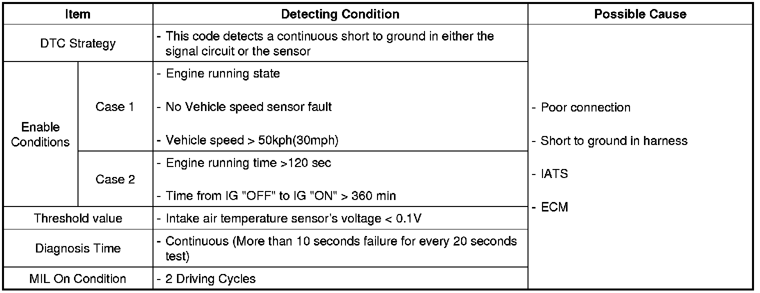 Checking output signals of IATS every 20 sec. under detecting condition, if an output signal is below 0.1V for more than 10 sec., ECM sets P0112. MIL (Malfunction Indication Lamp) turns on when the malfunction lasts till consecutive 2 driving cycle.