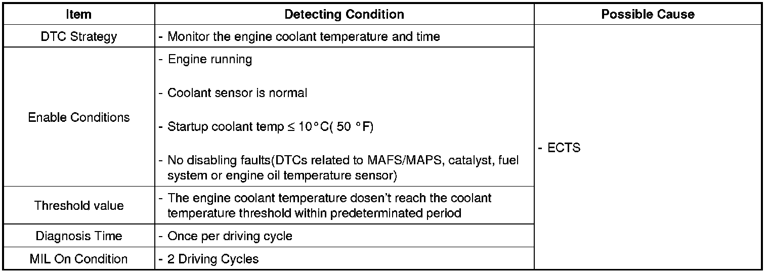 Checking time and coolant temperature under detecting condition, if the engine coolant temperature dose not exceed the coolant temperature threshold before the determinated period elapses, ECM sets P0125. MIL (Malfunction Indication Lamp) turns on when the malfunction lasts till consecutive 2 driving cycle.