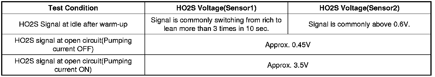 After warming-up, if accelerator pedal is released suddenly around 4000 rpm, the HO2S signal reading will be lower than 200 mV resulting from Fuel cut-off for the moment. Conversely, if suddenly accelerator pedal is depressed, HO2S signal reading will be around 0.6V ~ 1.0V. At idle, Normally HO2S signal will switch from lean to rich with 3 Hz. And as racing, Its frequency rises.