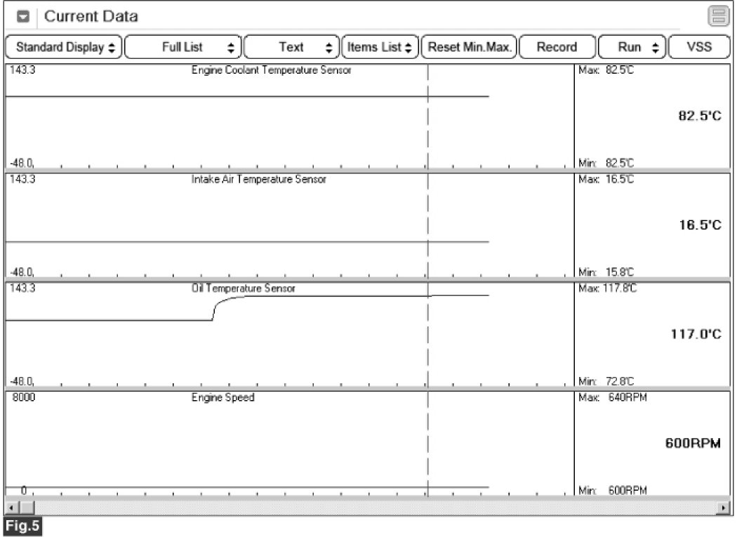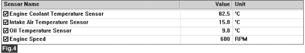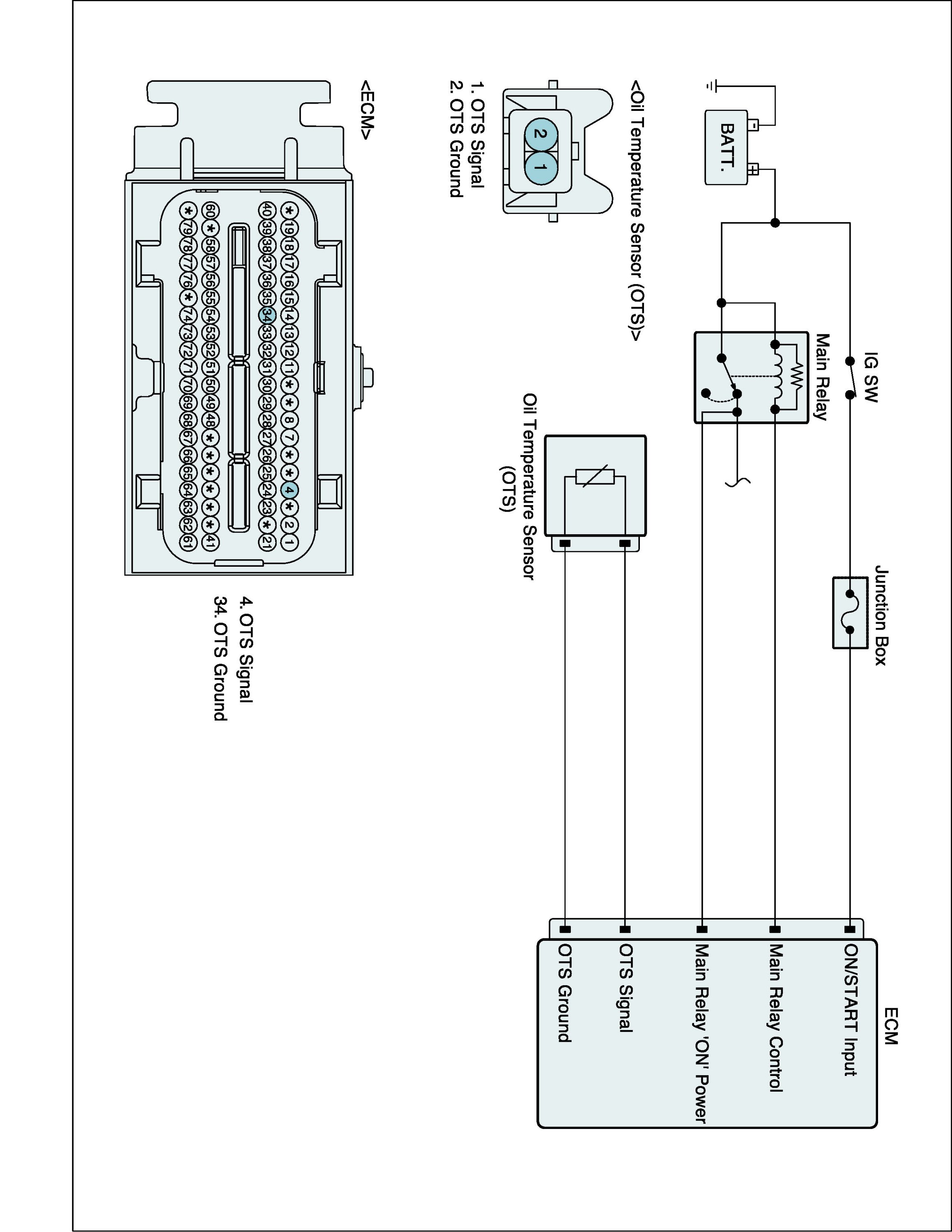 Checking the oil temperature, coolant temperature and intake air temperature every 25 sec. under detecting condition, if the difference in temperature at start-up exceeds threshold value, ECM sets P0196. MIL (Malfunction Indicating Lamp) turns on when the malfunction lasts till consecutive 2 driving cycle.