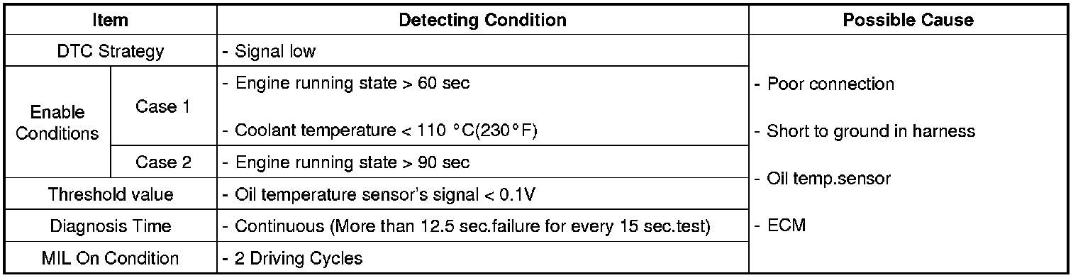 Checking output signals from oil temperature sensor every 15 sec. under detecting condition, if an signal is low for more than 12.5 sec., ECM sets P0197. MIL (Malfunction Indication Lamp) turns on when the malfunction lasts till consecutive 2 driving cycle.