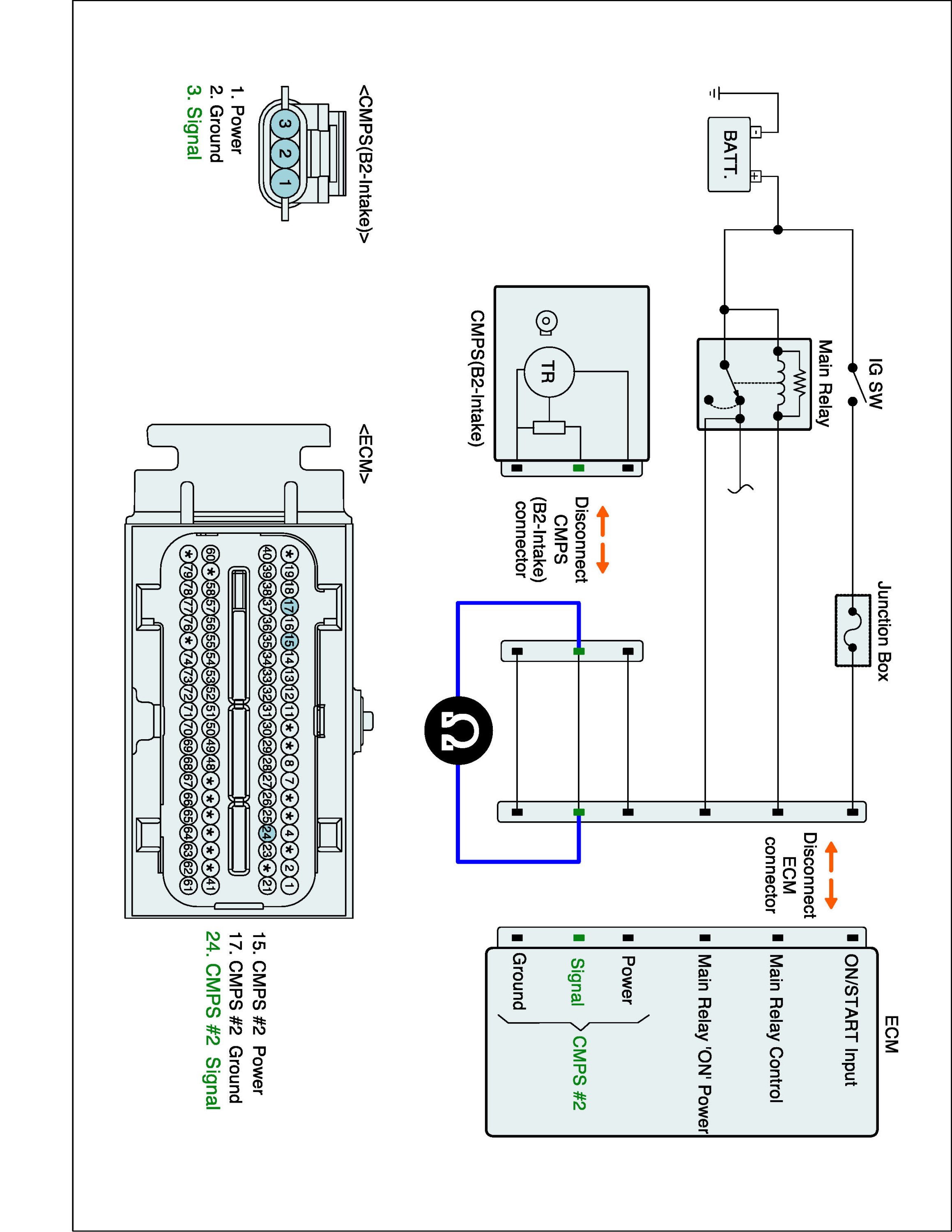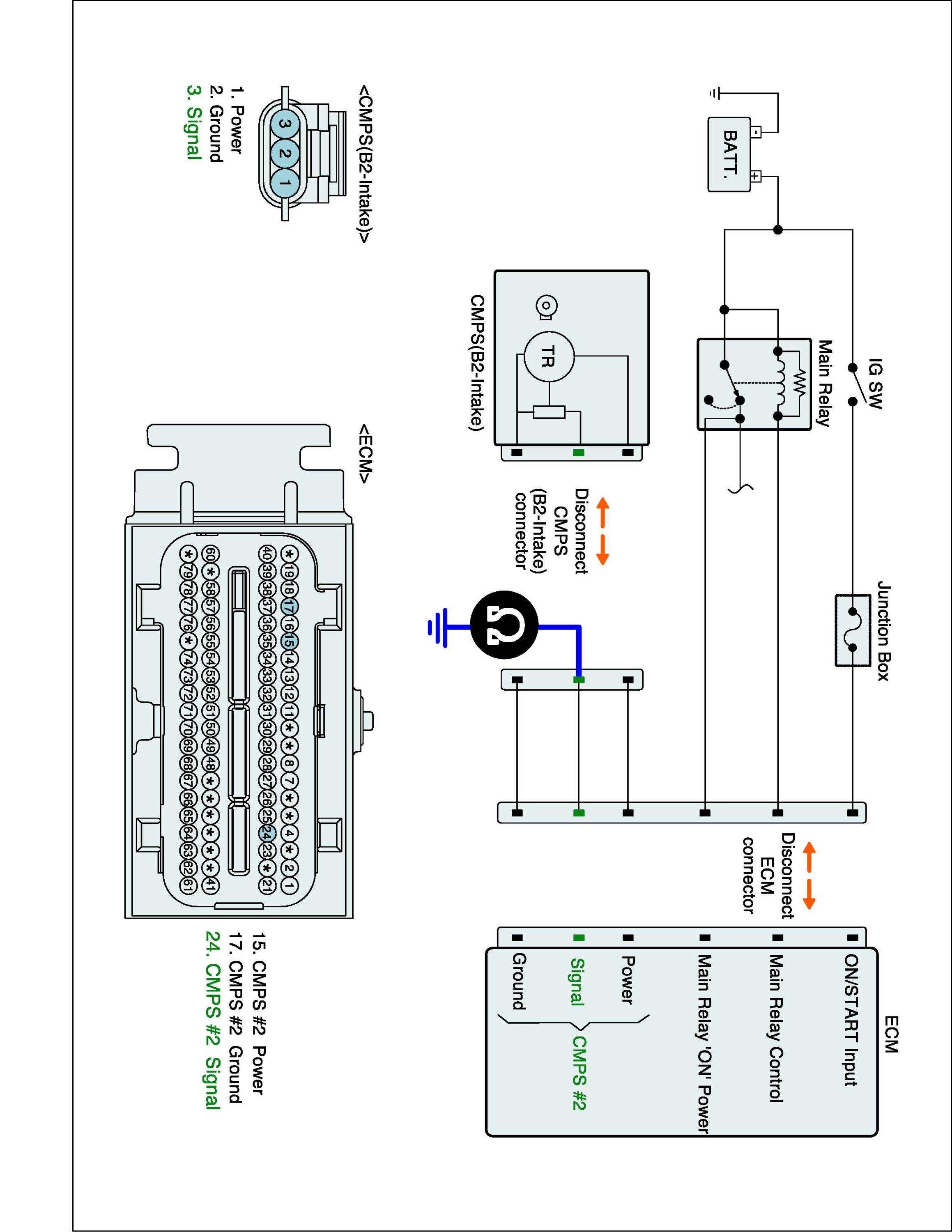 1. IG "OFF" and disconnect CMPS (B2-Intake) connector and ECM connector.