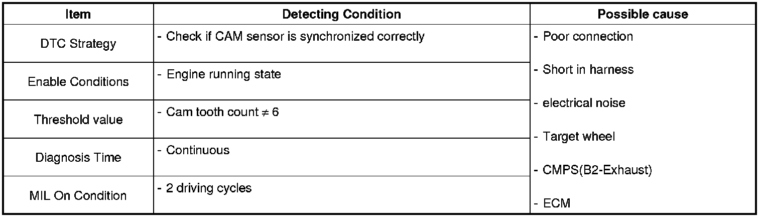 Checking output signals from CMP during engine running, if the expected number of cam tooth count is not observed, ECM sets P0391. MIL (Malfunction Indication Lamp) turns on when the malfunction lasts till consecutive 2 driving cycle.