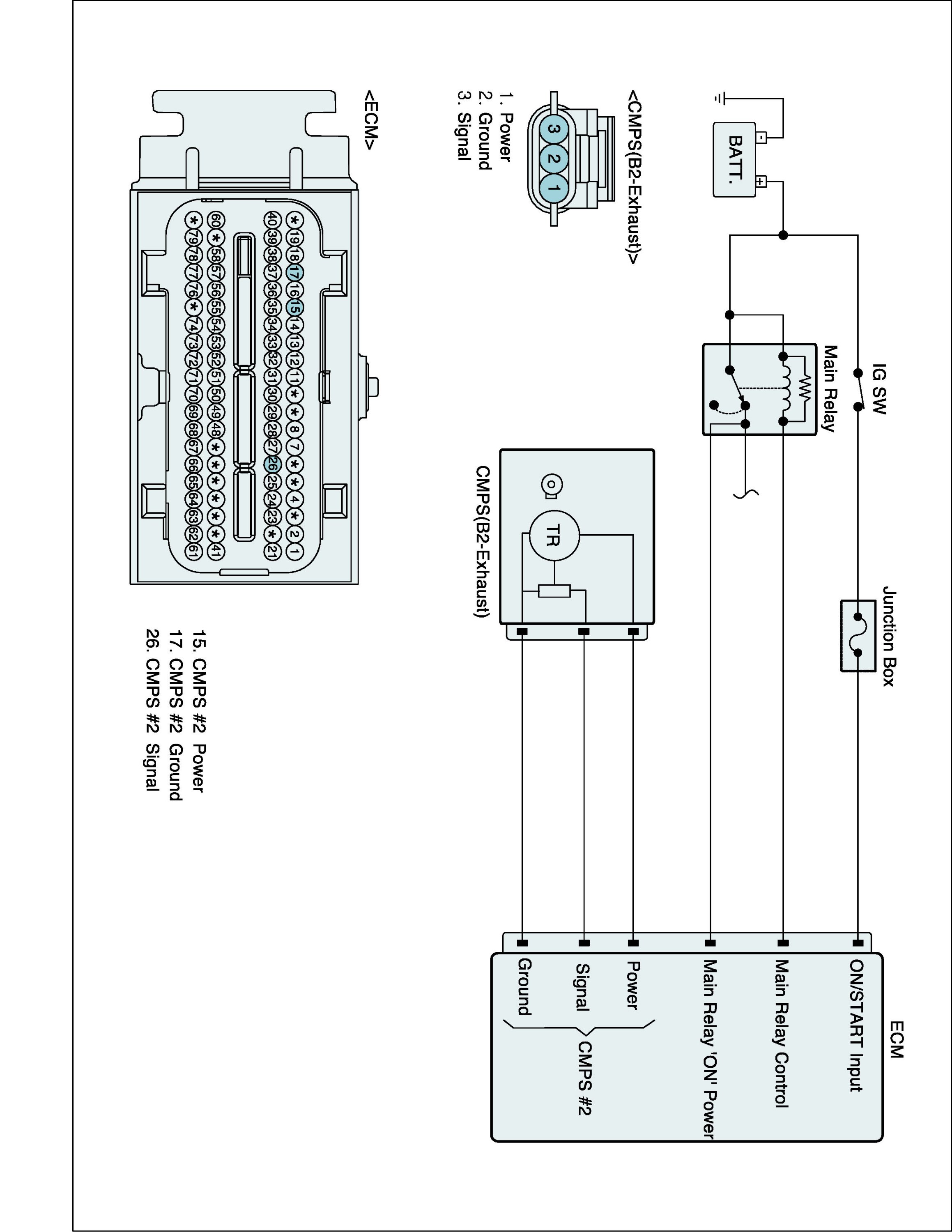 The Camshaft Position Sensor (CMPS) is a sensor that detects the compression TDC of the NO. 1 cylinder. The CMPS consists of a hall type sensor and a target on the end of the intake camshaft. When the target triggers the sensor, the sensor voltage is 5V. If not, the sensor voltage is 0V. These CMPS signal is sent to the ECM and the ECM uses the CMPS signal for synchronizing the firing of sequential fuel injectors.