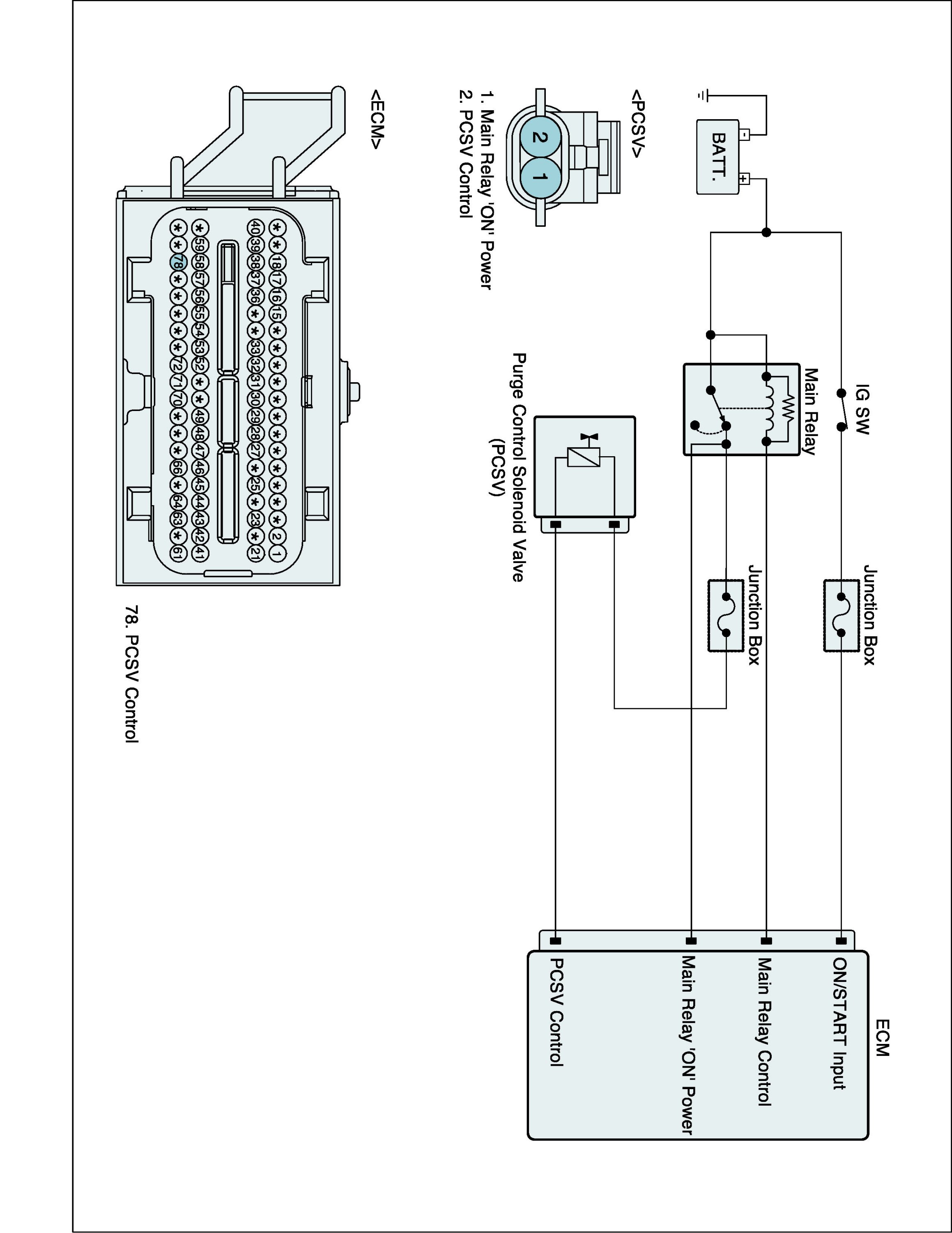 The evaporative emission control system prevents hydrocarbon (HC) vapors from the fuel tank from escaping into the atmosphere where they could form photochemical smog. Gasoline vapors are collected in the charcoal canister. The ECM controls the Purge Control Solenoid Valve (PCSV) to purge any collected vapors from the canister back to the engine for combustion. This valve is actuated by the purge control signal from the ECM and controls fuel vapor from the canister to the intake manifold.