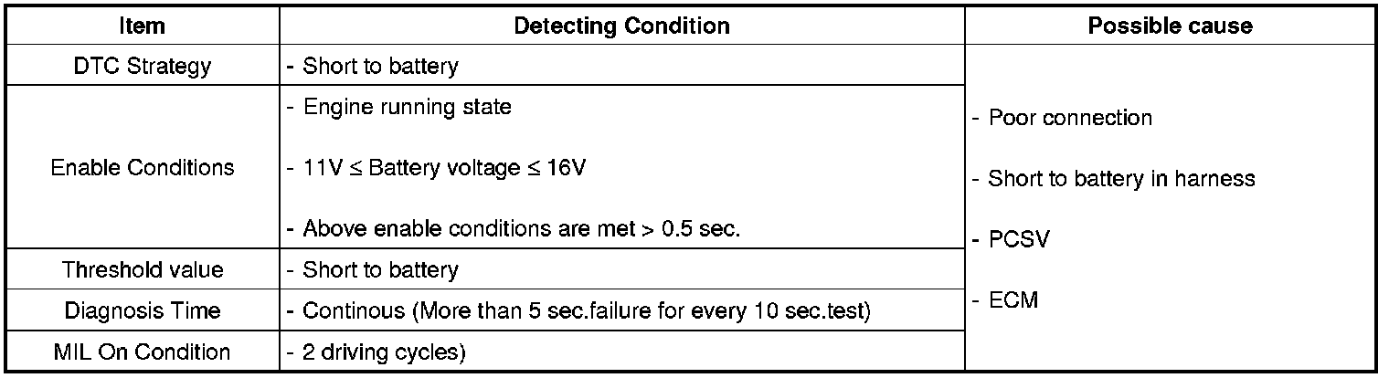 Checking output signals from PCSV every 10 sec. under detecting condition, if signals indicating short to battery in the circuit are detected for more than 5 sec., ECM sets P0445. MIL (Malfunction Indication Lamp) turns on when the malfunction lasts till consecutive 2 driving cycle.