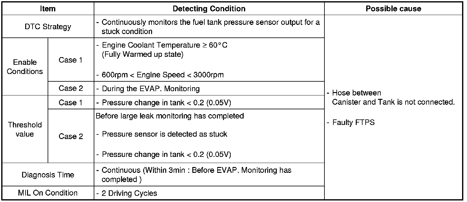 Checking output signals of tank pressure under detecting condition, if the tank pressure does not change less than 0.2 (0.05V) within 3min., ECM sets P0451. MIL (Malfunction Indication Lamp) turns on when the malfunction lasts till consecutive 2 driving cycle.
