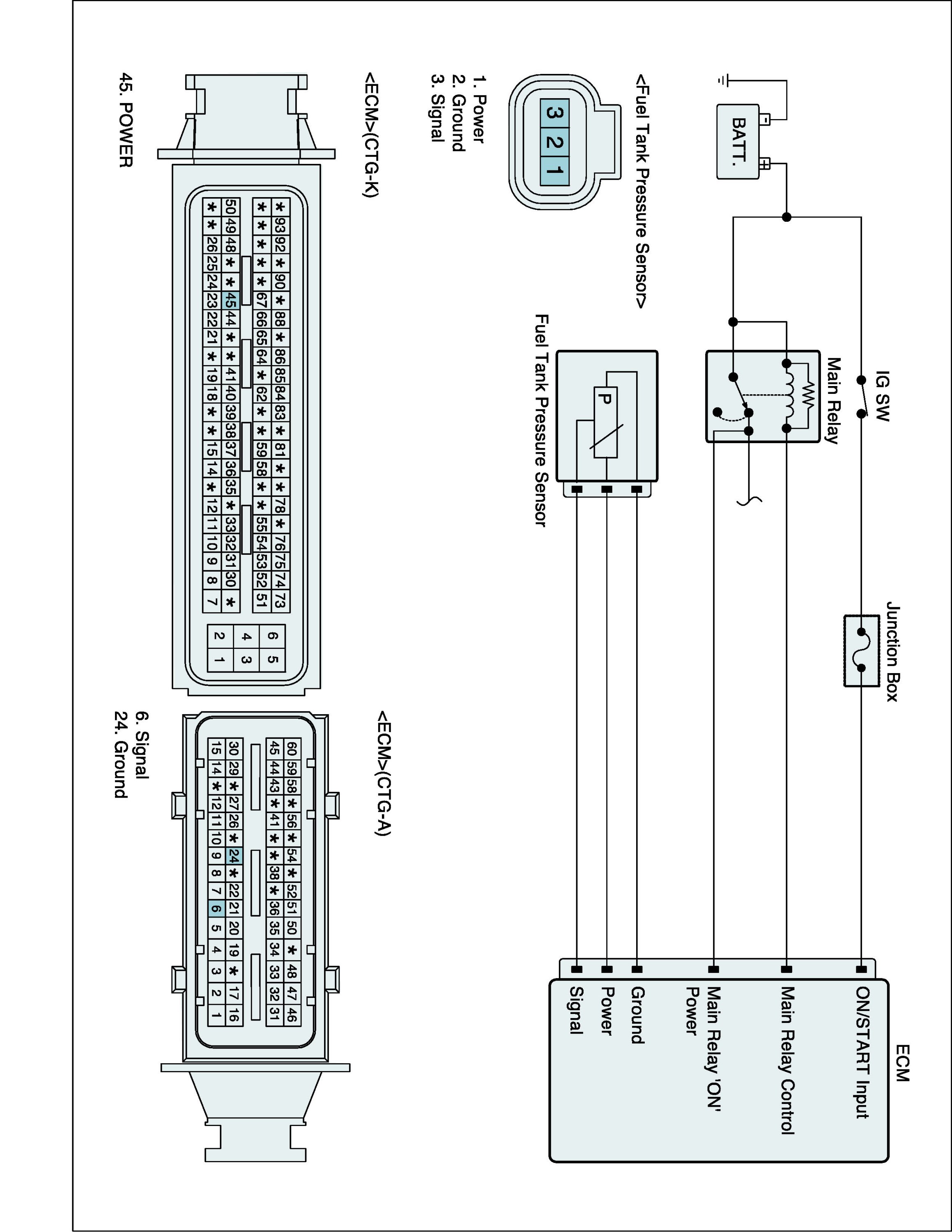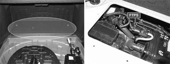 The evaporative emission control system prevents hydrocarbon vapors from escaping from the fuel tank into the atmosphere where they could form photochemical smog. Gasoline vapors are collected in the charcoal canister. The Fuel Tank Pressure Sensor (FTPS) is an integral part of the evaporative monitoring system. The ECM monitors the FTPS signal to detect vacuum decay and excess vacuum. The FTPS measures the difference between the air pressure inside the fuel tank and outside air pressure to check the purge control solenoid valve operation and for leak detection in the evaporative emission control system by monitoring pressure and vacuum levels in the fuel tank during the purge control solenoid valve operating cycles.
